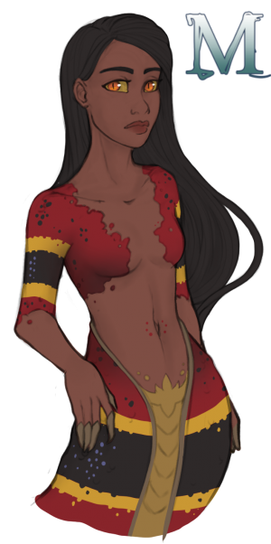 The reclusive and secretive Naga are talented alchemists who tend to be fascinated by natural properties, and their keen eyesight gives them natural skill with a bow. Their skin ranges through a variety of colours from dull tones to brighter colours, scales speckling their skin over their limbs and around their faces in varying degrees. Their teeth are fanged, and their eyes have slit pupils with the iris having a wide range of inheritable colour variations. Their hair tends to compliment the colour of their scales so that they can have better camouflage.